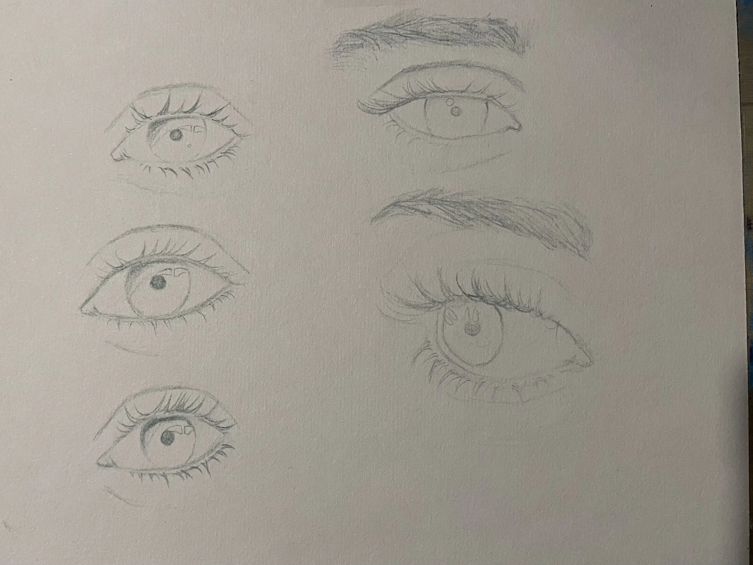 A detailed pencil sketch of a human eye, showing the eye with eyelashes, iris, and reflections in the pupil.