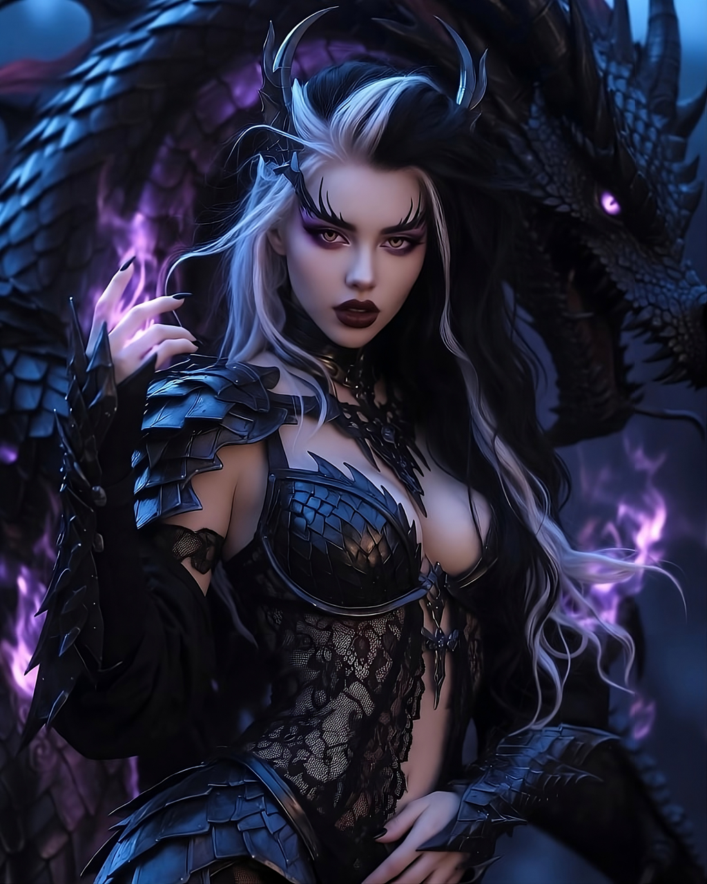 A woman with black hair and a black leather armor dress, sitting on a dark bed with a dark background.