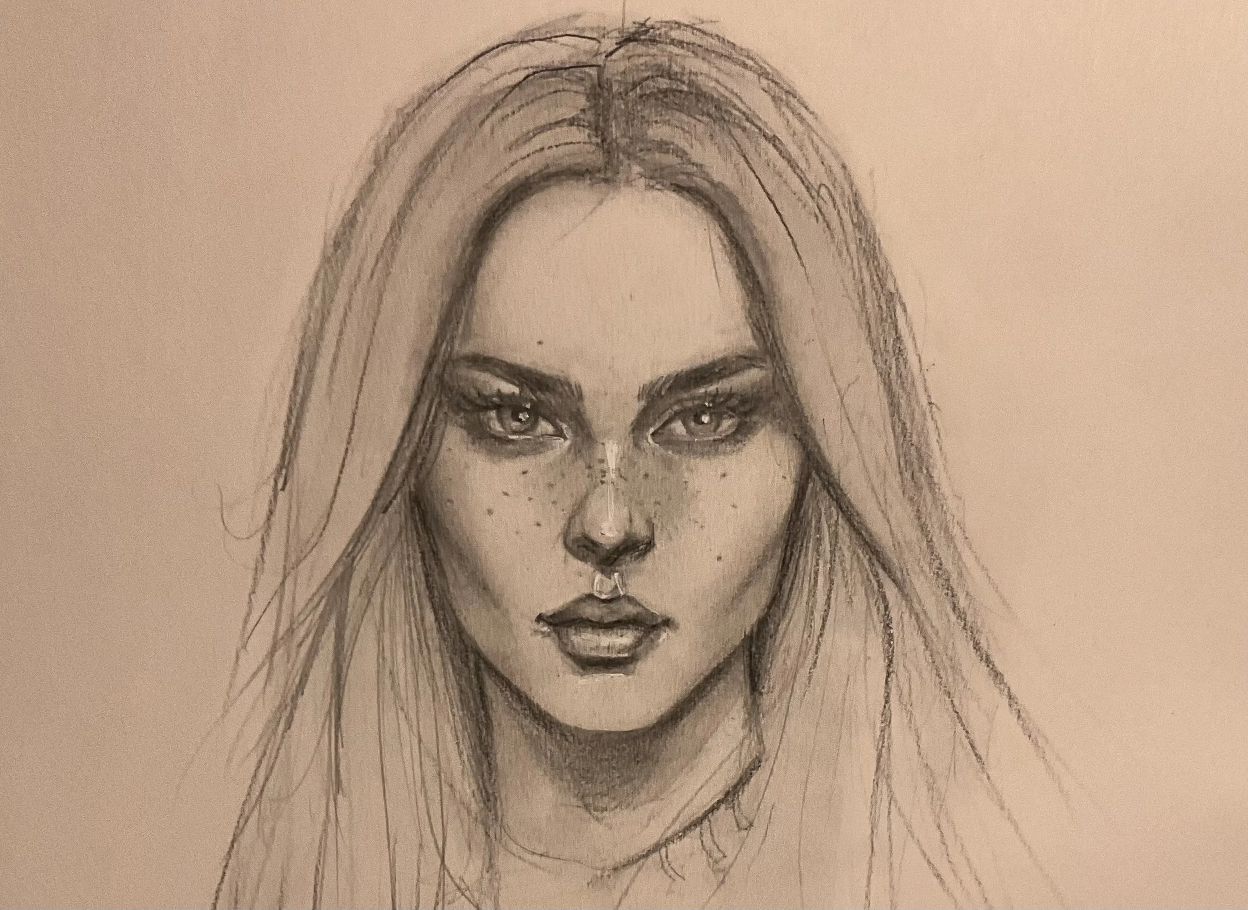 A detailed pencil sketch of a woman with long, wavy hair, intense eyes, full lips, and defined facial features, with a partial view of her shoulder.