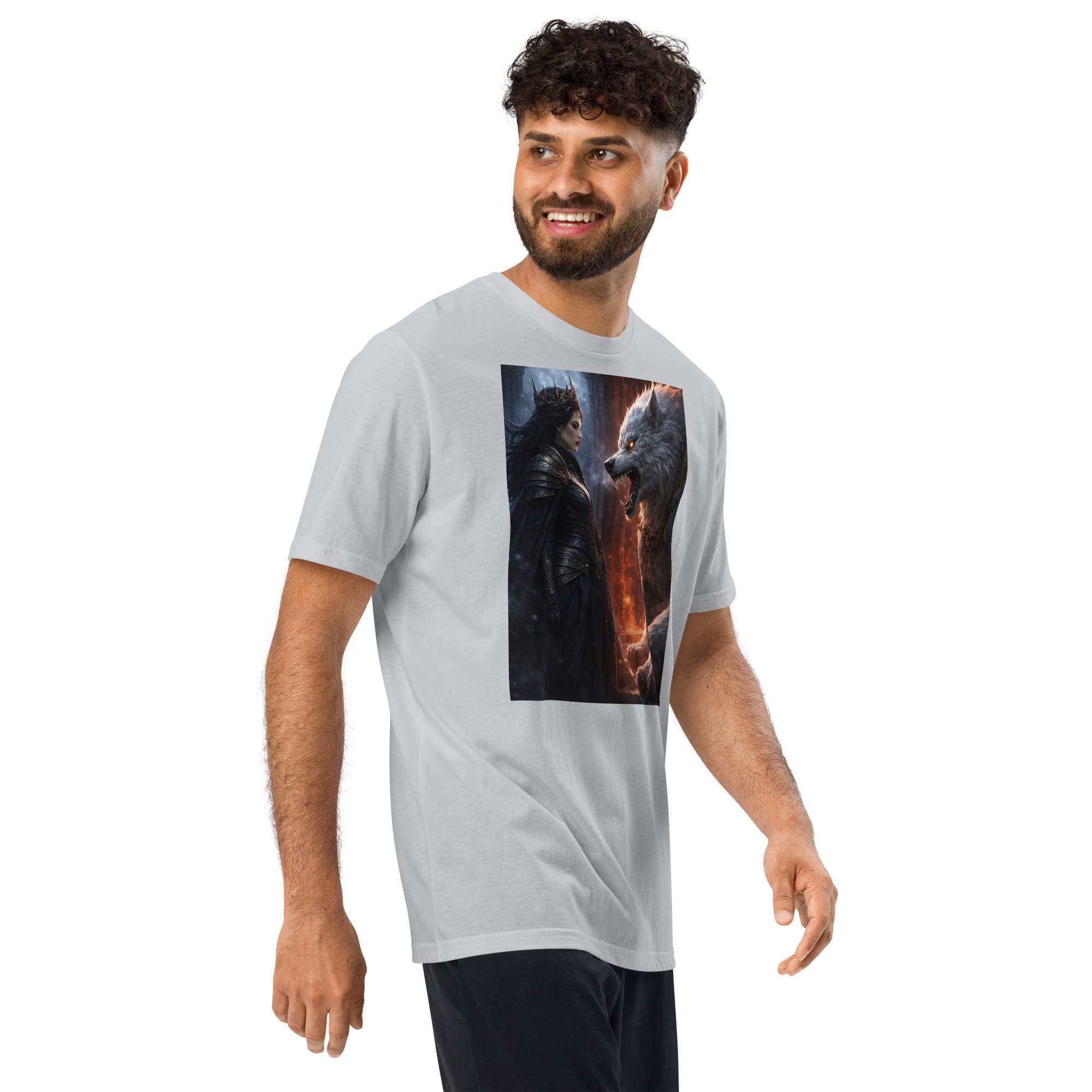 Crown and Fang depicts the moment before submission or defiance — when authority and instinct stand eye to eye. A composed female sovereign faces a massive wolf forged from fire and shadow, neither retreating, neither striking. The tension is deliberate. Power is being weighed, not unleashed.