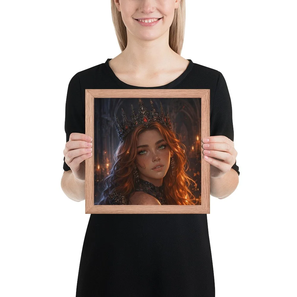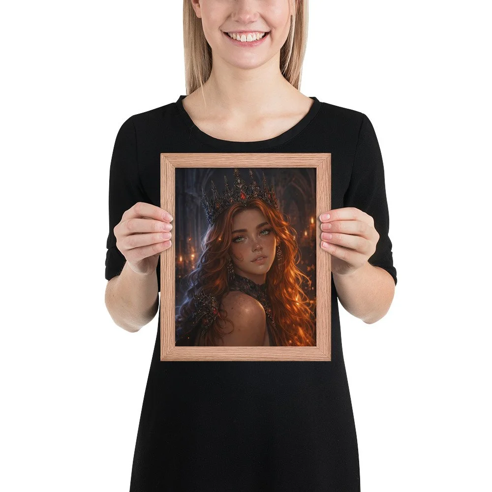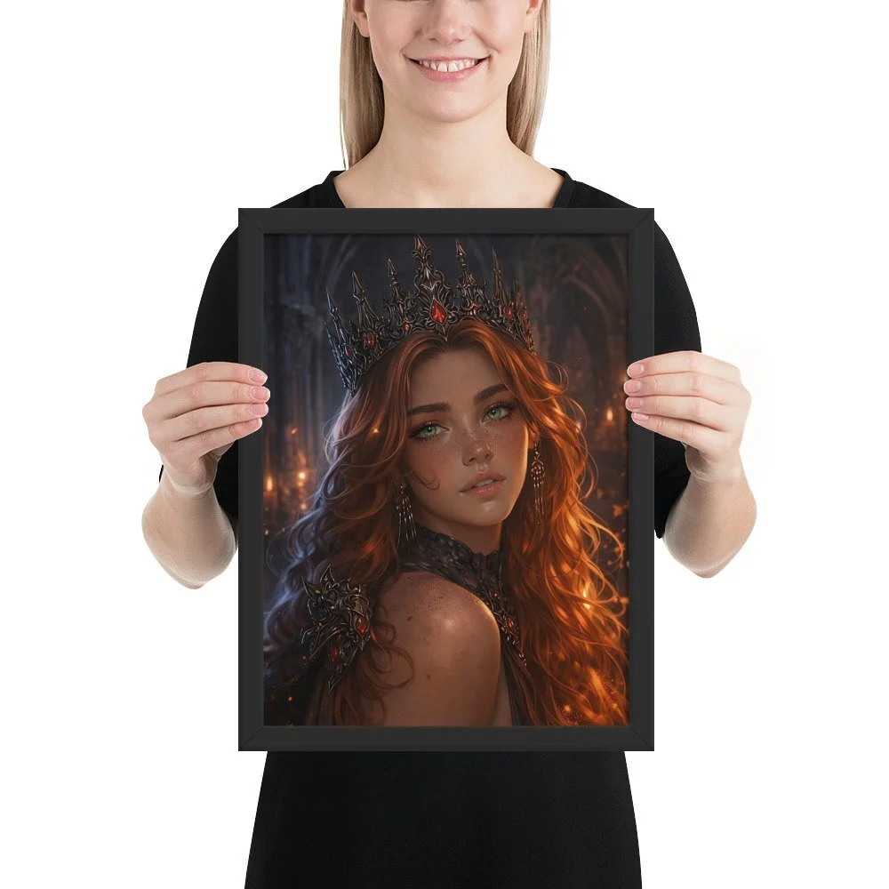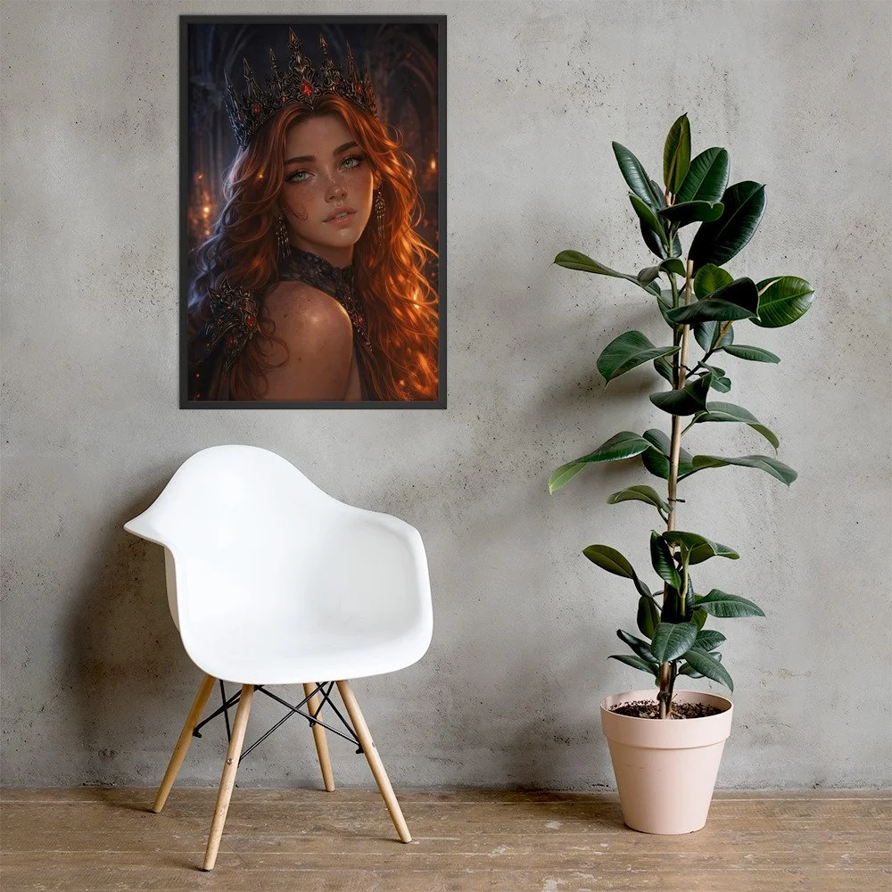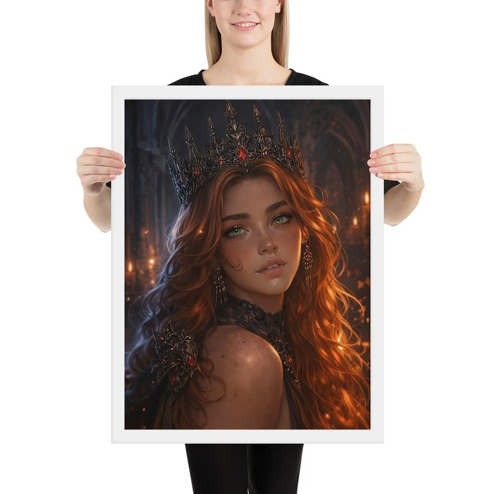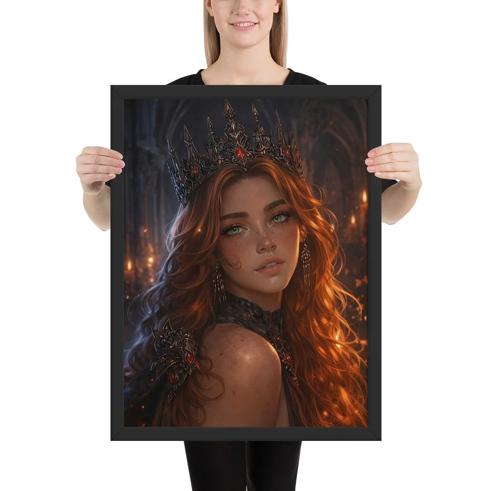 Printed on thick enhanced matte paper and presented in a choice of three refined frame finishes, this piece is built to read as a statement rather than décor. The mood is disciplined dark fantasy—elegance over excess, control over chaos. There’s a faint echo of the Empress archetype, kept intentionally subtle and expressed through presence alone.