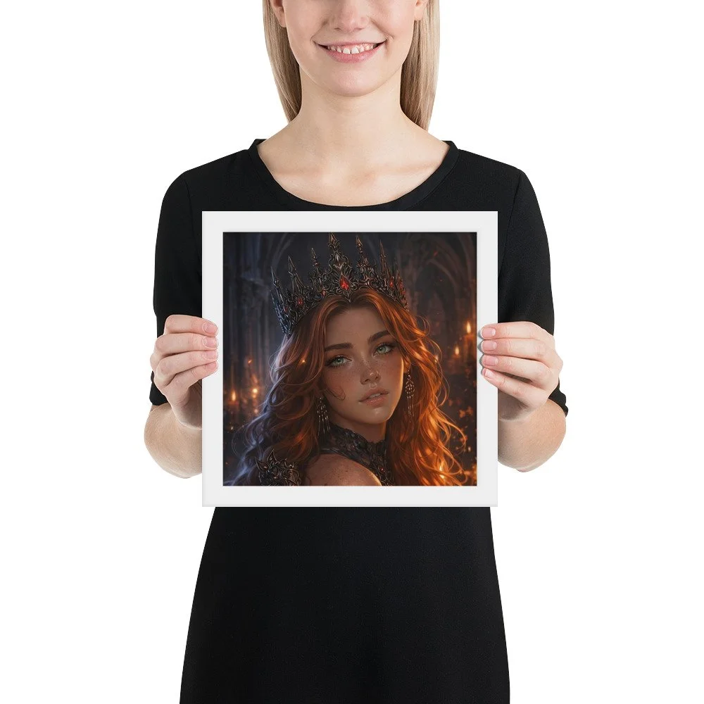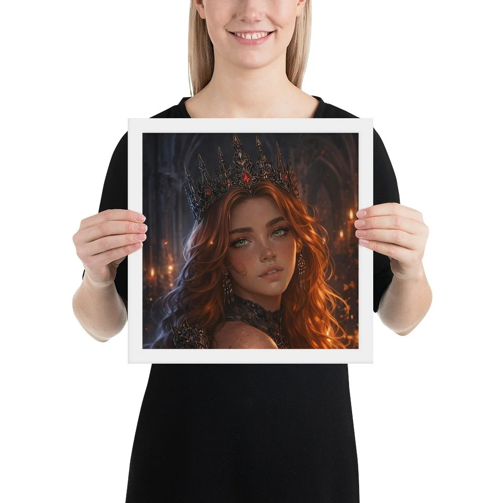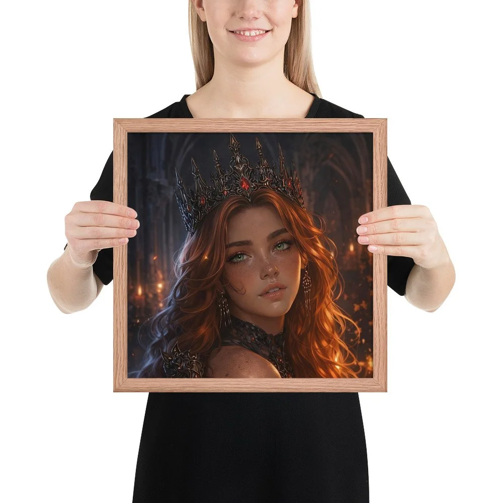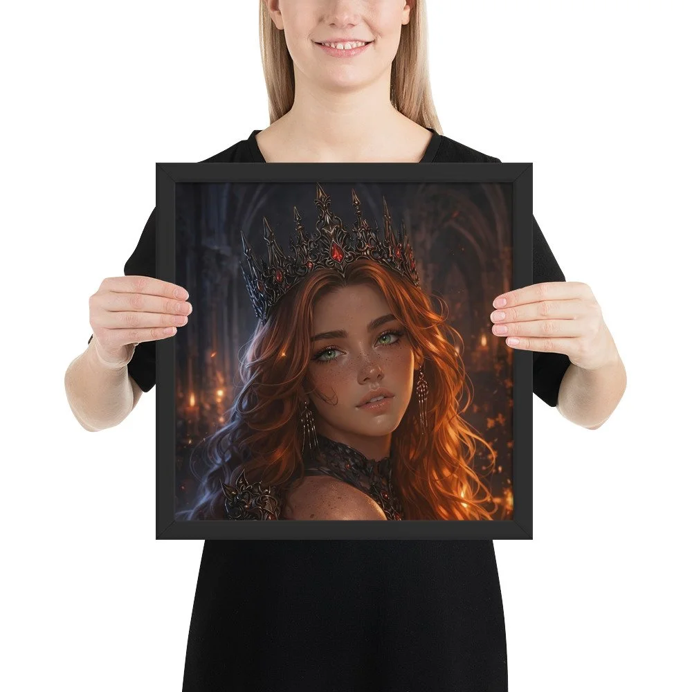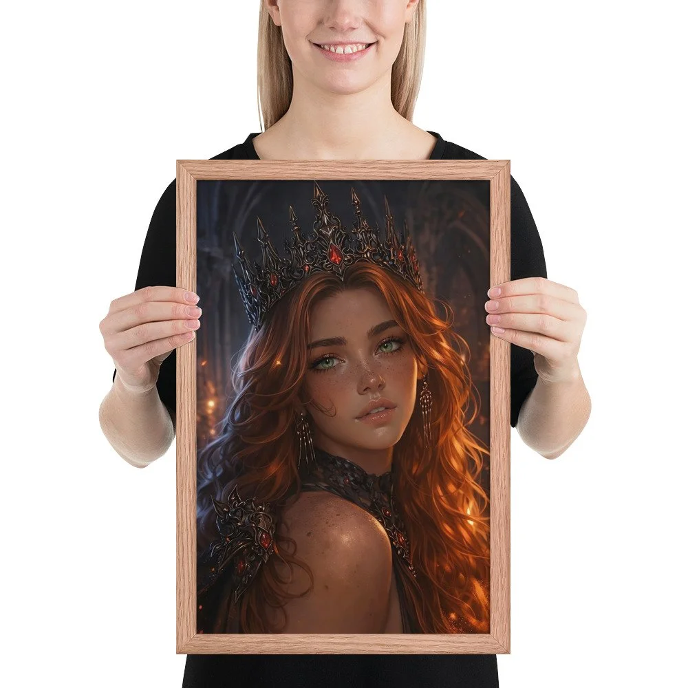 Printed on thick enhanced matte paper and presented in a choice of three refined frame finishes, this piece is built to read as a statement rather than décor. The mood is disciplined dark fantasy—elegance over excess, control over chaos. There’s a faint echo of the Empress archetype, kept intentionally subtle and expressed through presence alone.