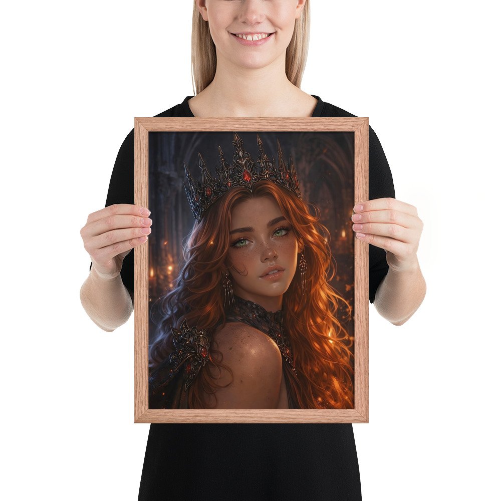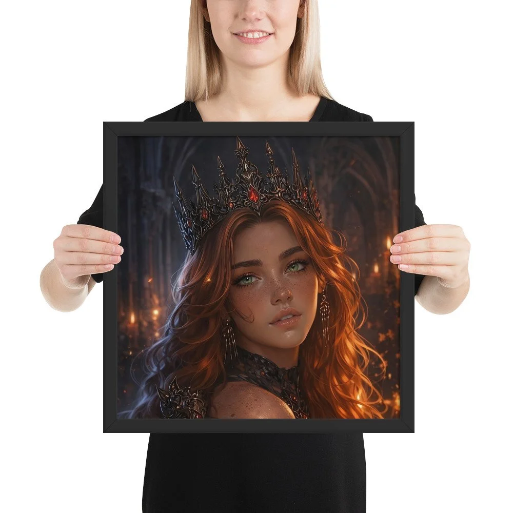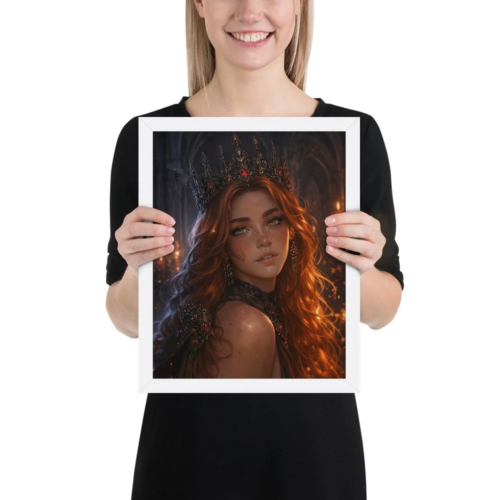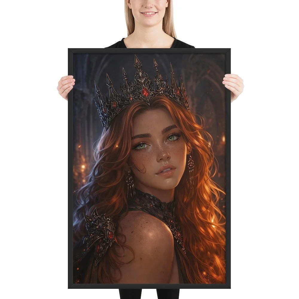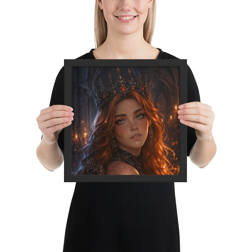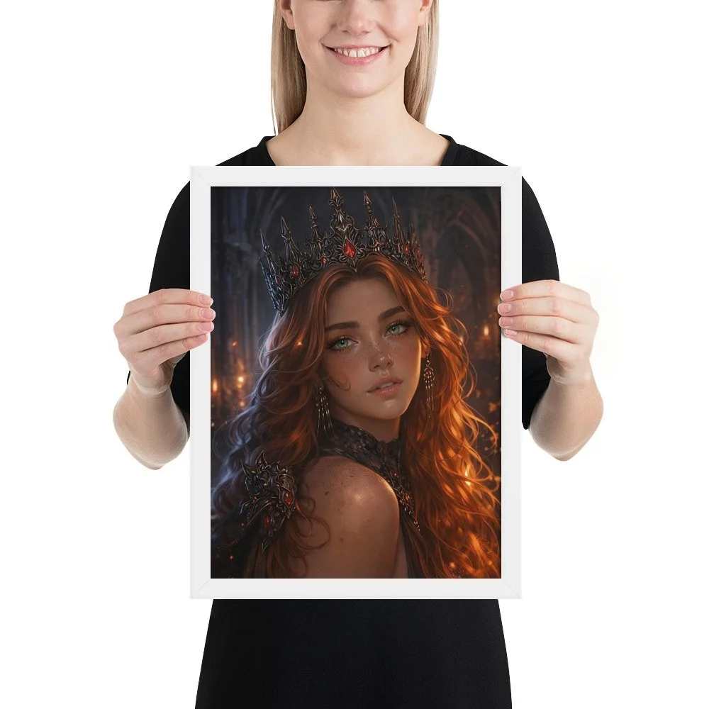 Printed on thick enhanced matte paper and presented in a choice of three refined frame finishes, this piece is built to read as a statement rather than décor. The mood is disciplined dark fantasy—elegance over excess, control over chaos. There’s a faint echo of the Empress archetype, kept intentionally subtle and expressed through presence alone.