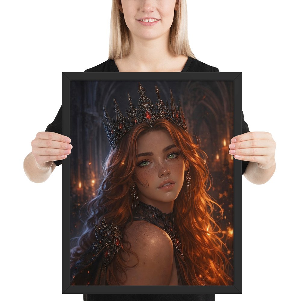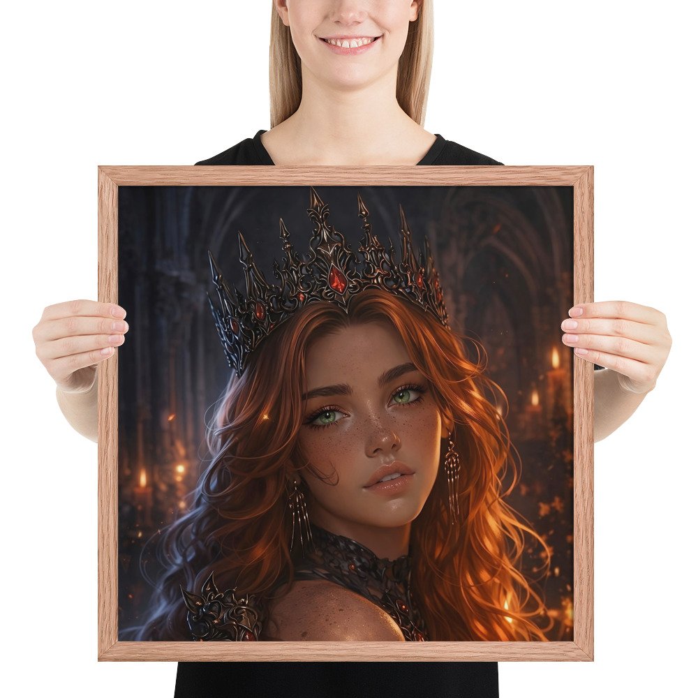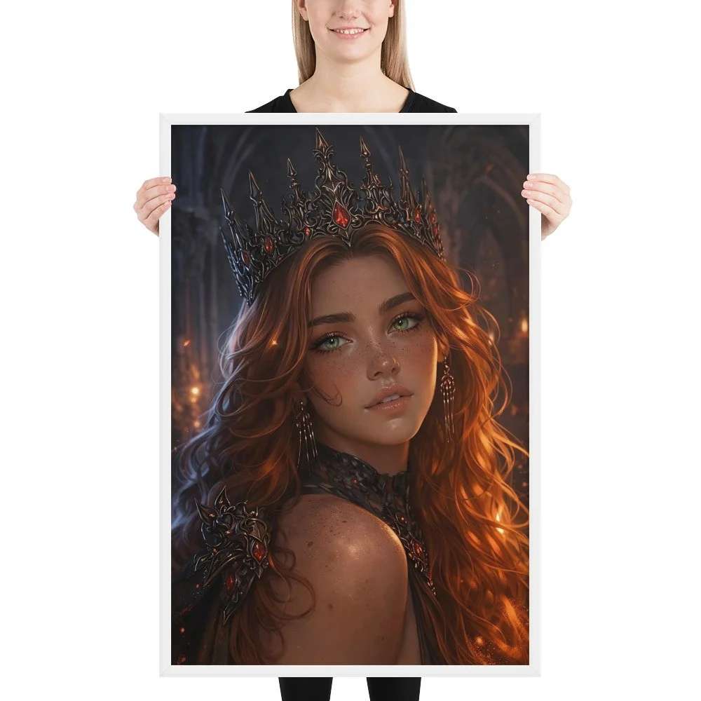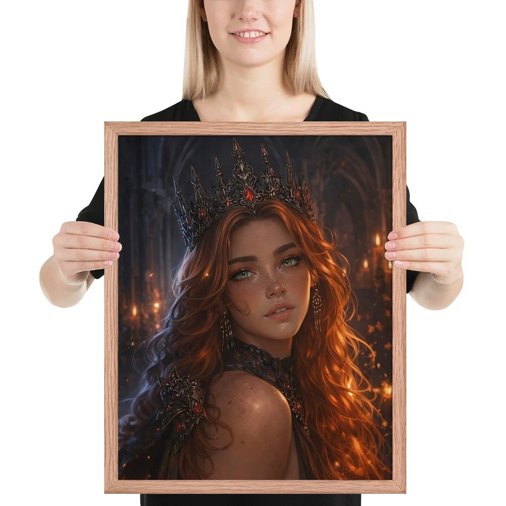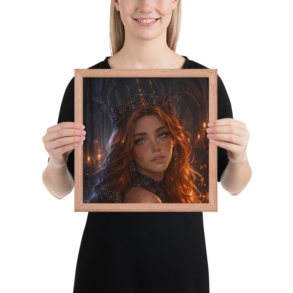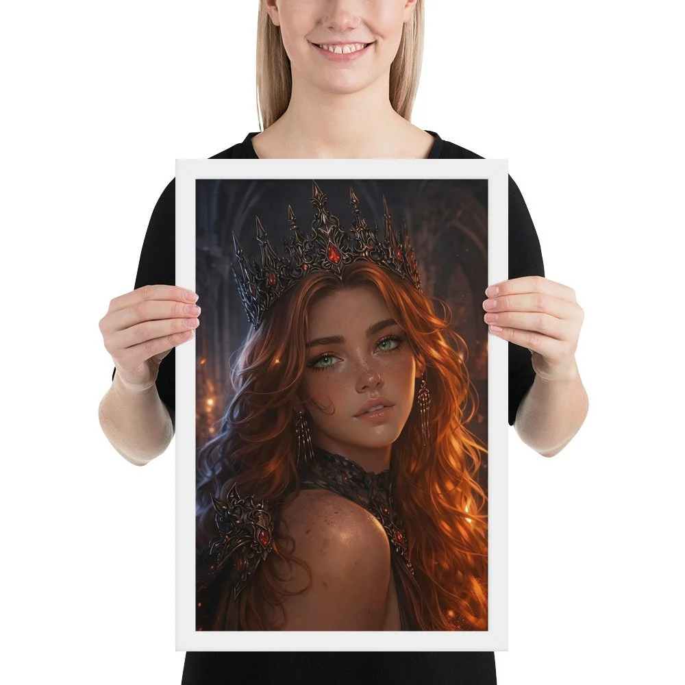 Printed on thick enhanced matte paper and presented in a choice of three refined frame finishes, this piece is built to read as a statement rather than décor. The mood is disciplined dark fantasy—elegance over excess, control over chaos. There’s a faint echo of the Empress archetype, kept intentionally subtle and expressed through presence alone.