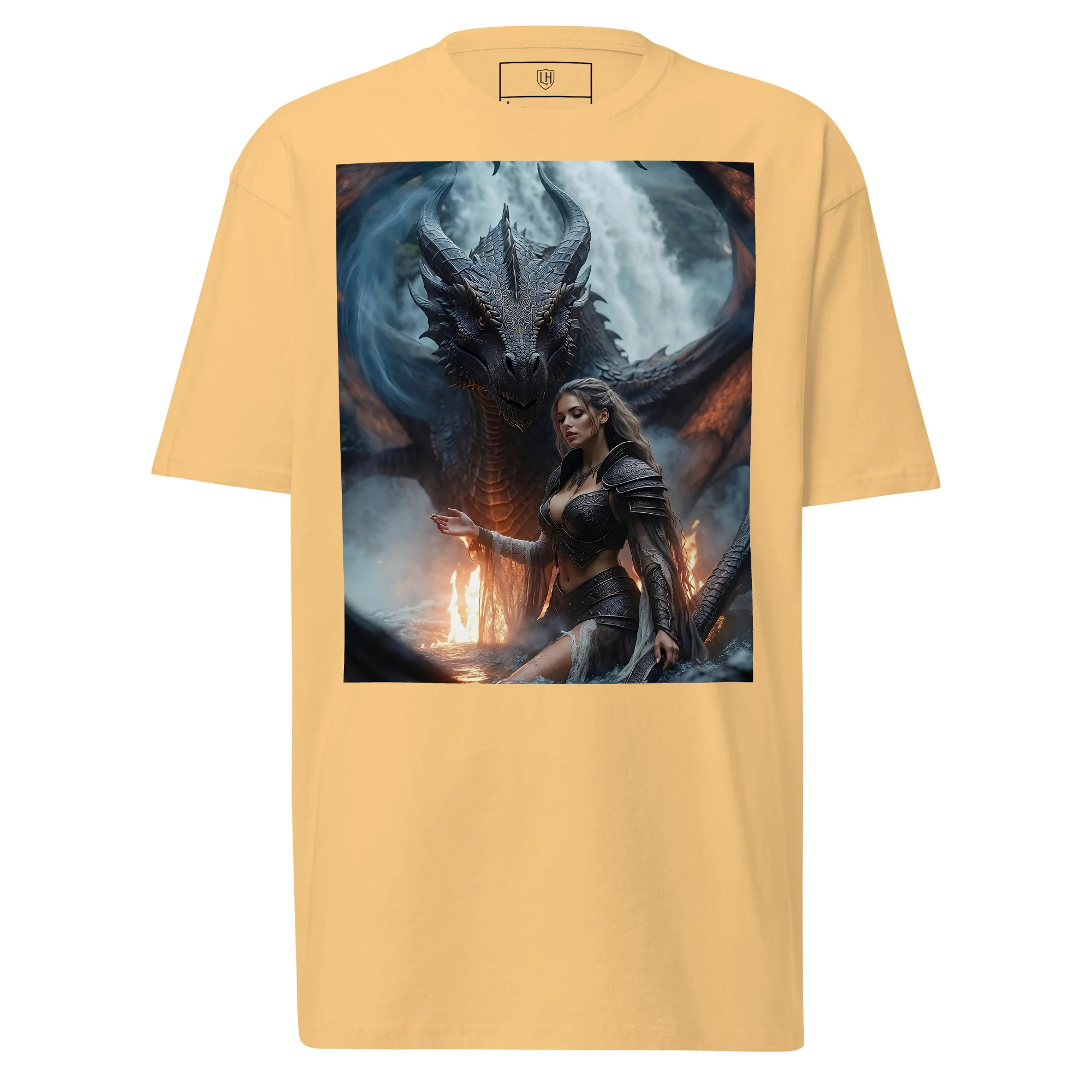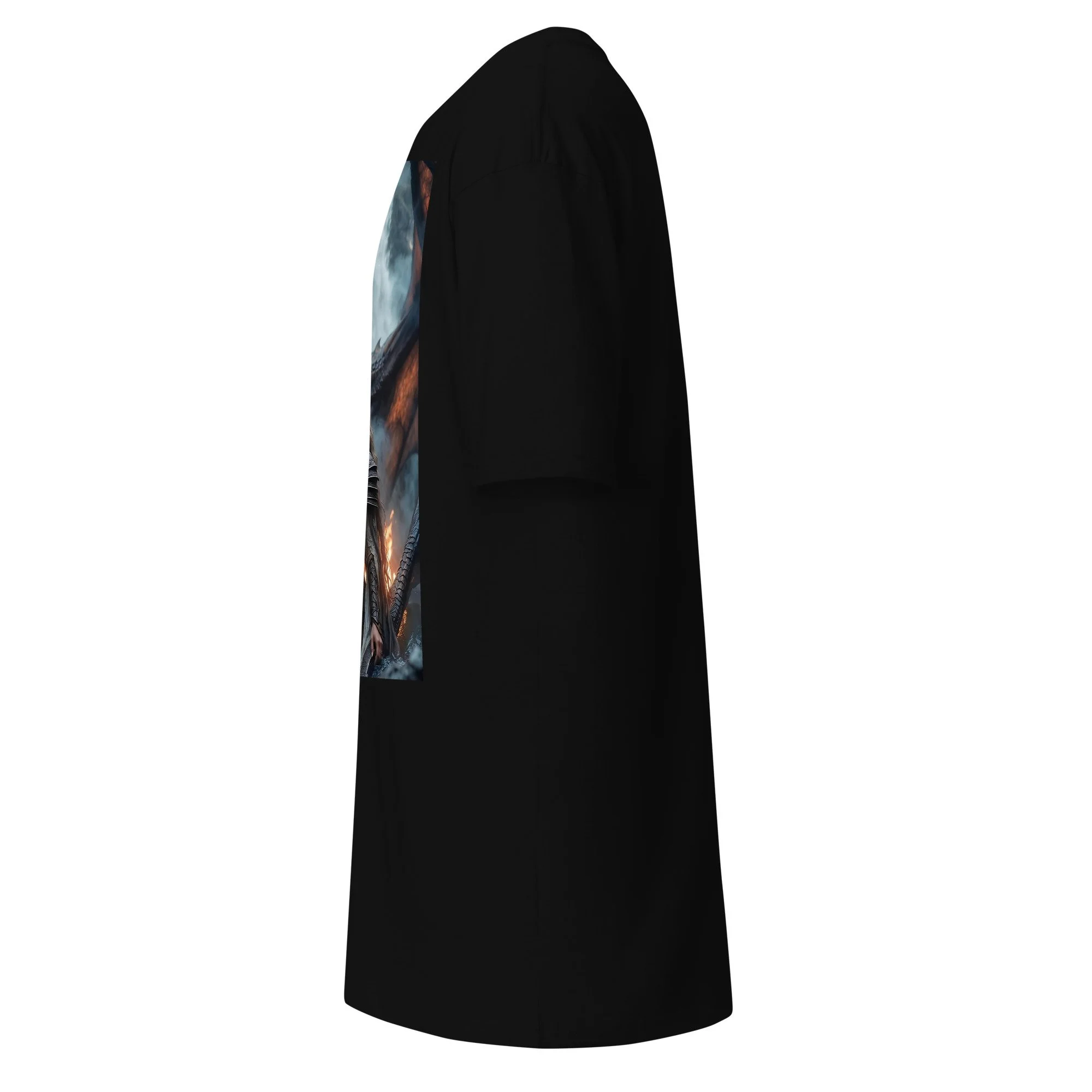 The scale is mythic and merciless: steel against flame, will against dominion. The dragon doesn’t roar to impress—it watches, weighs, and condemns. The figure below isn’t posing for glory—she’s braced for the moment where courage becomes proof.