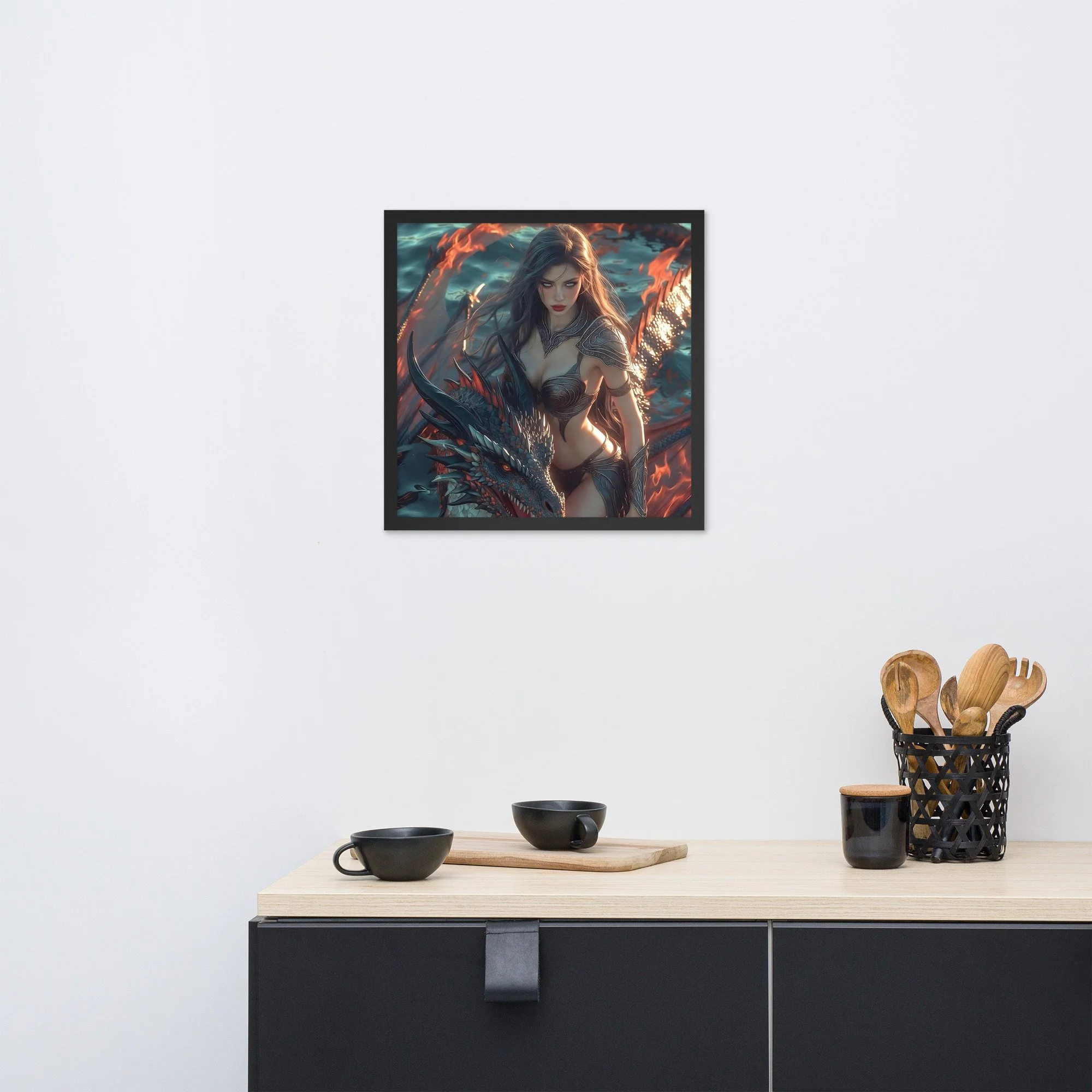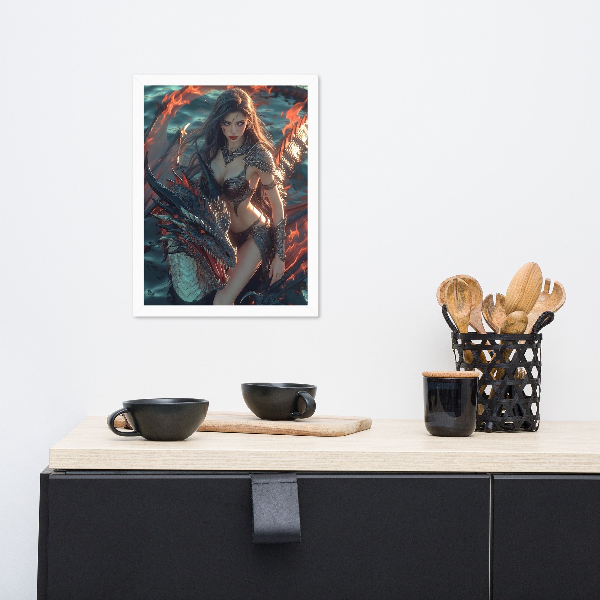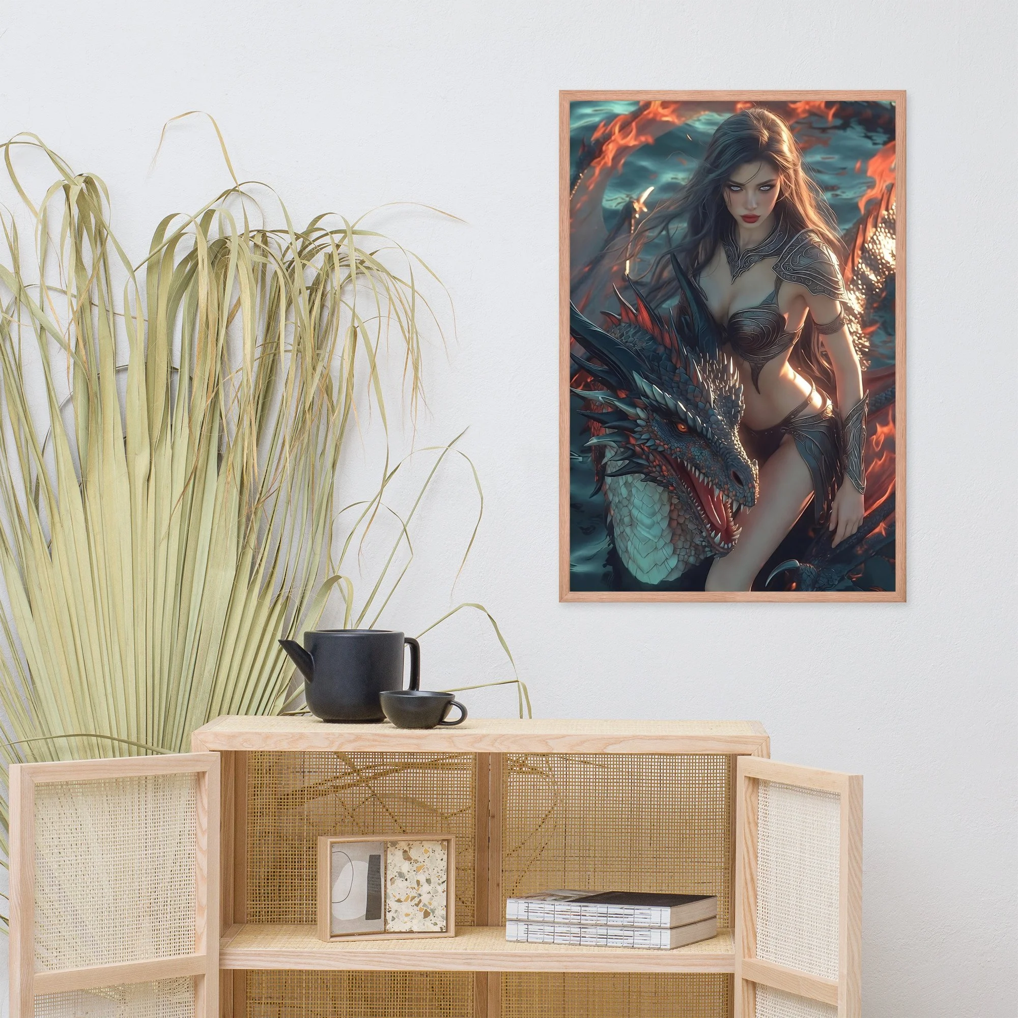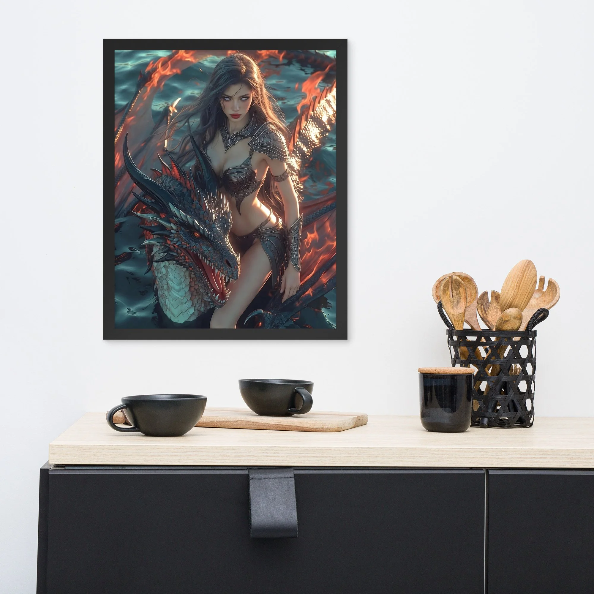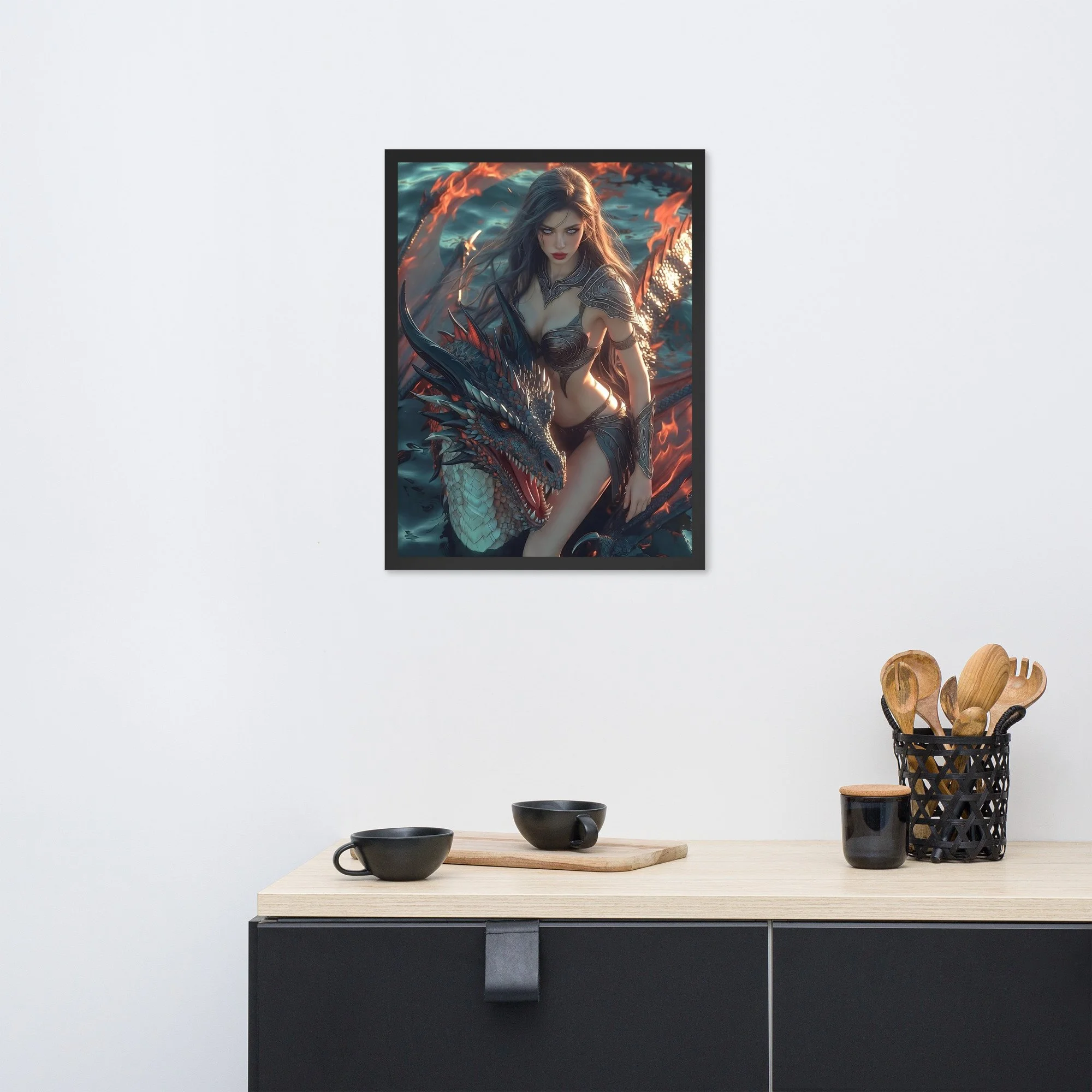 Rendered in cinematic dark-fantasy realism, this framed poster is printed on thick matte paper and finished in a sleek black frame, giving the artwork weight and presence without distraction. Every detail — from the ember-lit atmosphere to the tension between flesh and scale — is designed to command attention in any space.