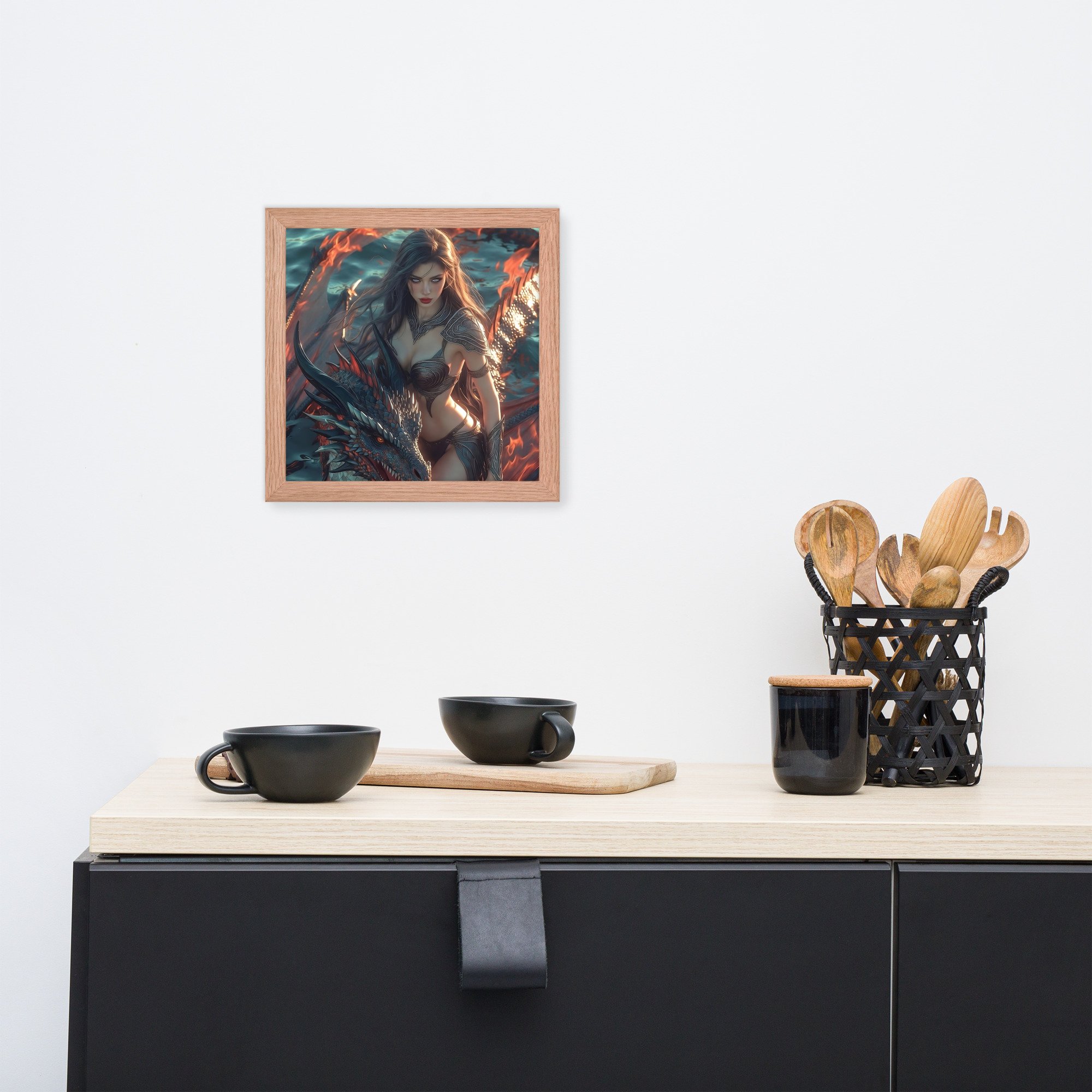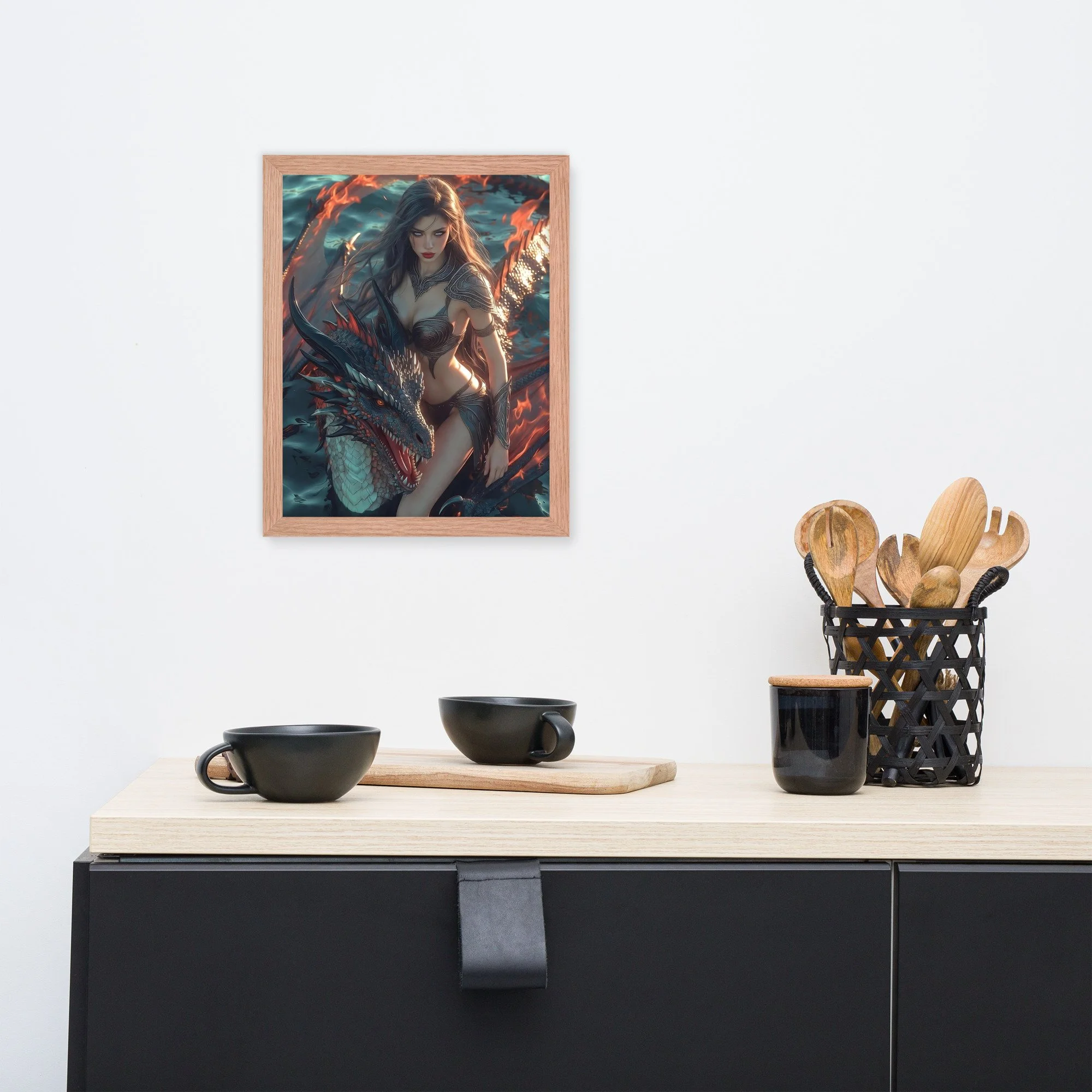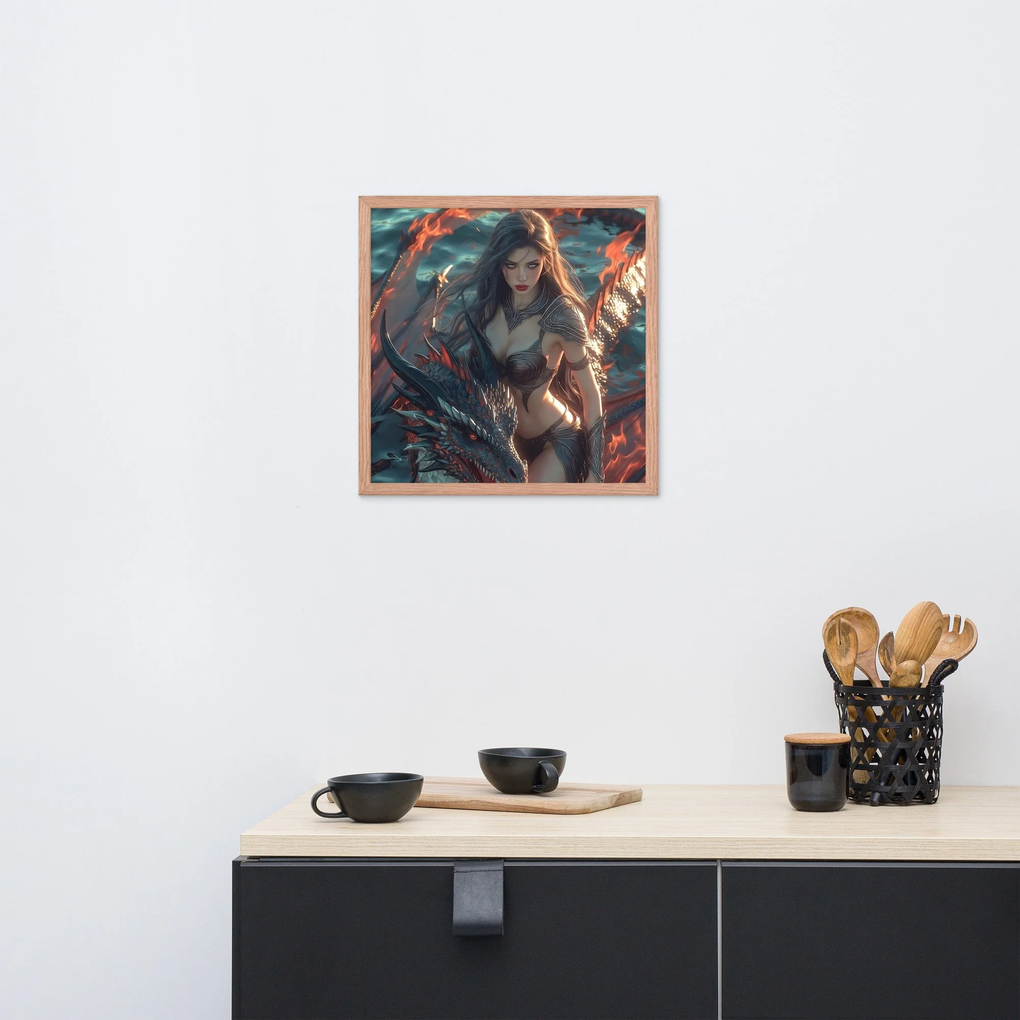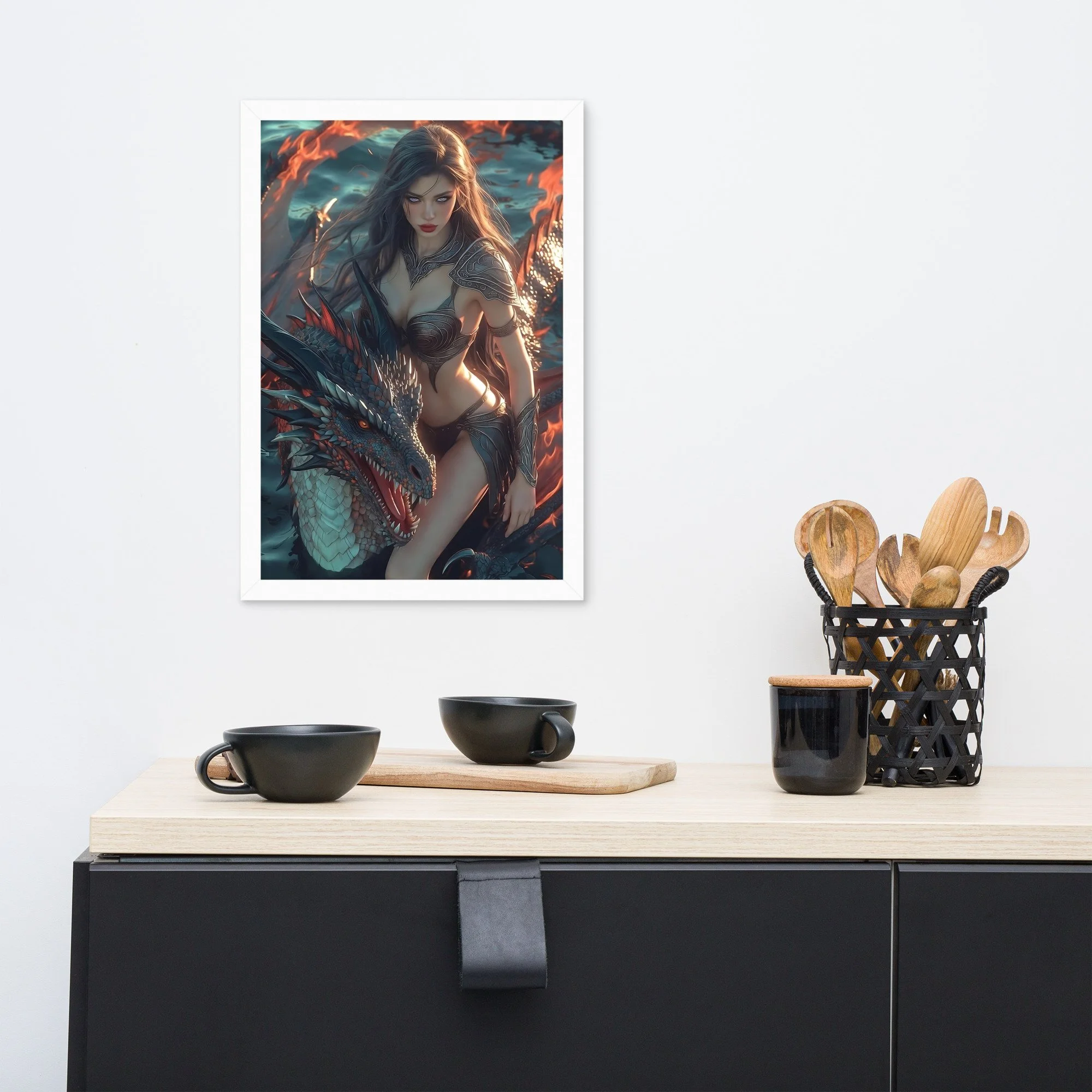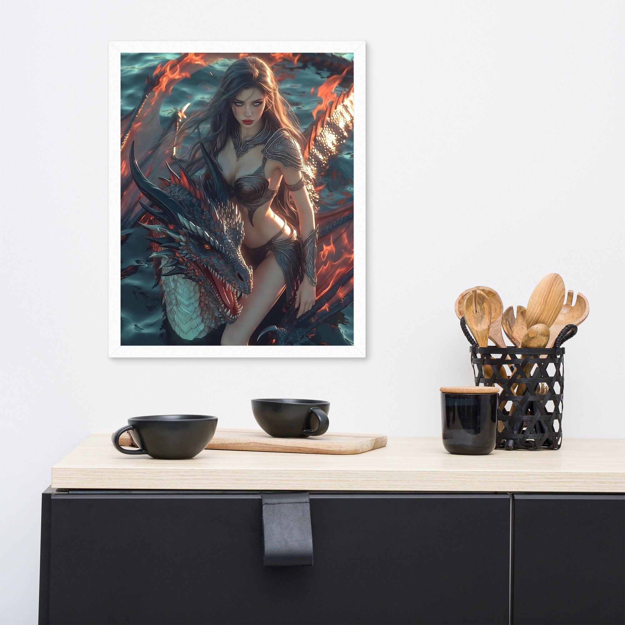 Rendered in cinematic dark-fantasy realism, this framed poster is printed on thick matte paper and finished in a sleek black frame, giving the artwork weight and presence without distraction. Every detail — from the ember-lit atmosphere to the tension between flesh and scale — is designed to command attention in any space.